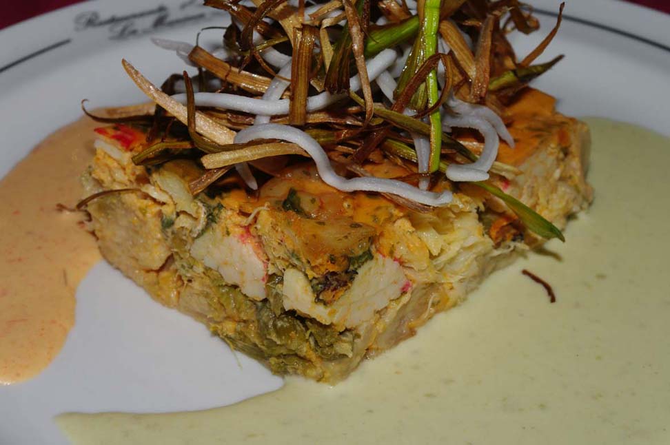 Pastel de Verdura con Pescado de Roca y Marisco, acompañado de Salsa de Pimiento Morrón y Piquillo - Se abre en ventana nueva